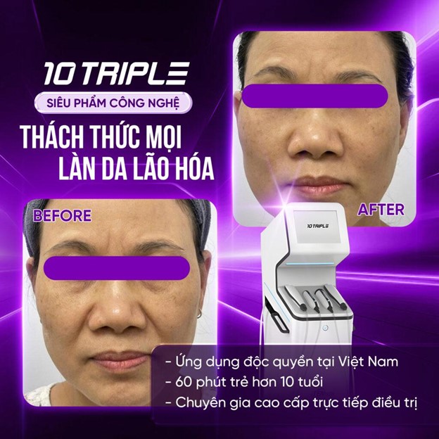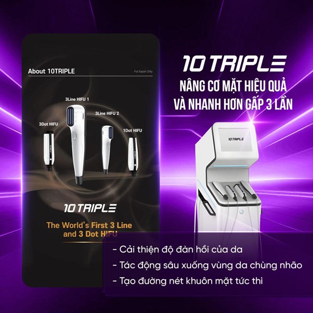 Ngoài ra, hệ thống cảm biến nhiệt thời gian thực giúp tự ngắt khi quá ngưỡng an toàn, đảm bảo trị liệu chính xác và an toàn cho mọi đối tượng khách hàng. Đa dạng đầu phát Line & Dot còn cho phép cá nhân hóa từng phác đồ theo từng vùng da, mang lại sự nâng đỡ tối ưu cho khách hàng. 10TRIPLE, như một “kiến trúc sư điêu khắc gương mặt”, mang đến sự thay đổi rõ rệt không xâm lấn, phù hợp với nhịp sống hiện đại, mong muốn hiệu quả tức thì không cần nghỉ dưỡng.