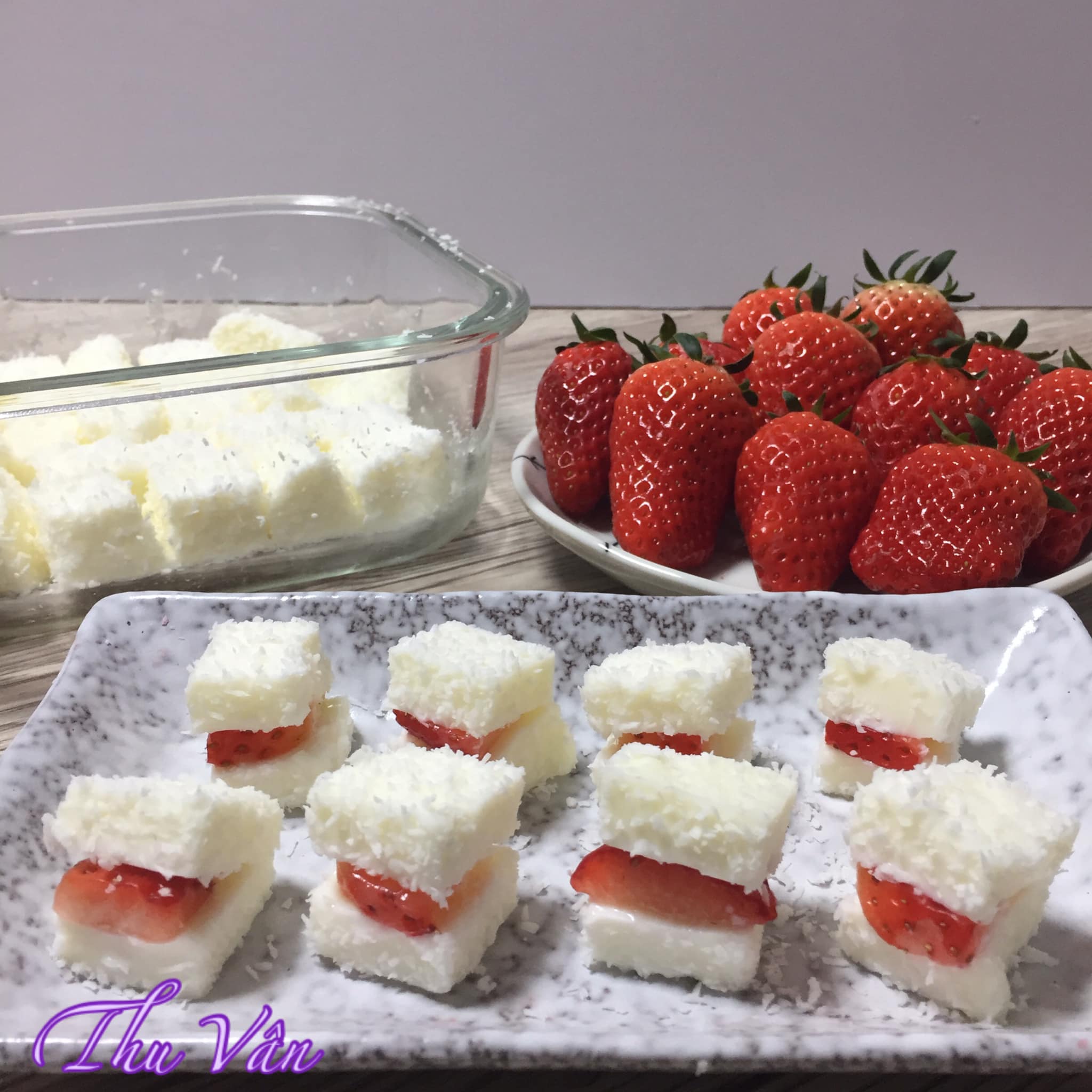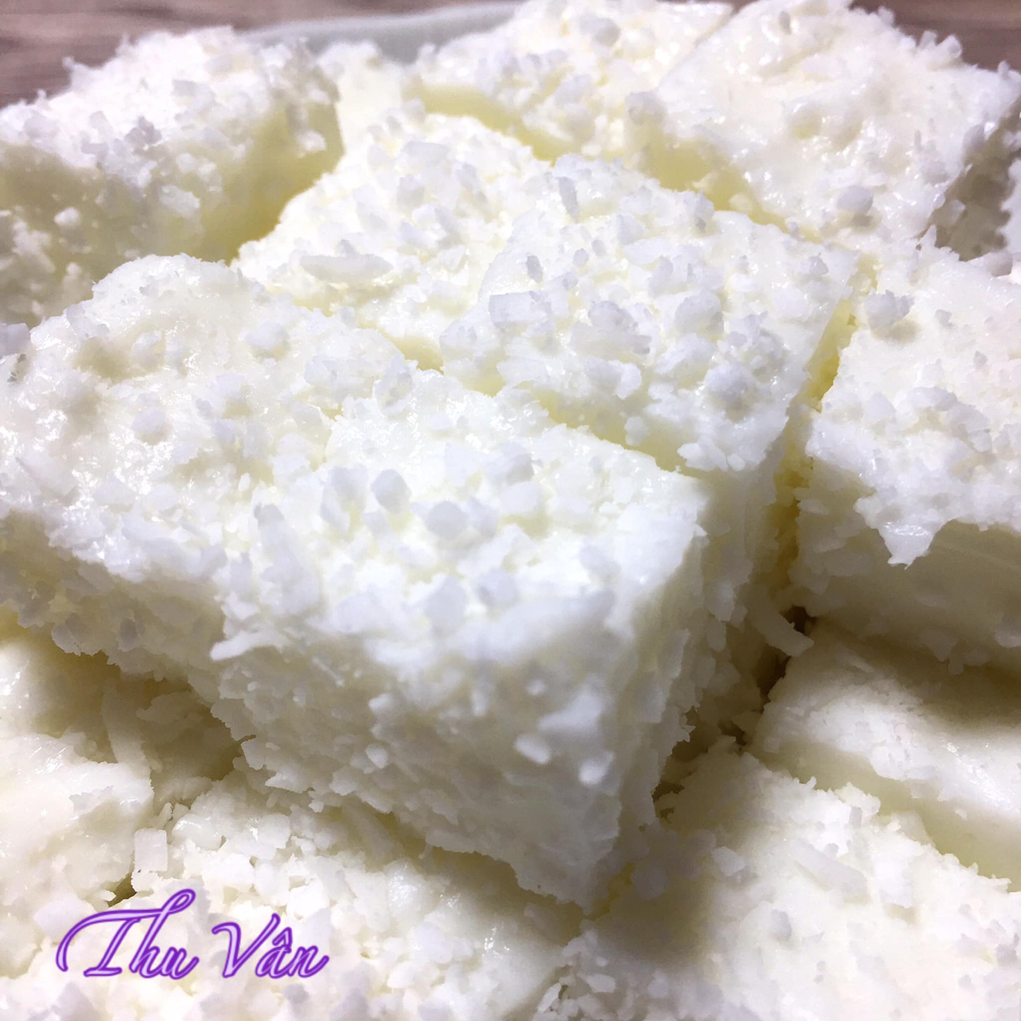 7. Bánh làm lạnh xong, cắt thành các khối vuông đều nhau, lăn các mặt còn lại qua dừa vụn. Dùng dao xẻ khối bánh làm 2 nửa, cố gắng không cắt đứt rời.