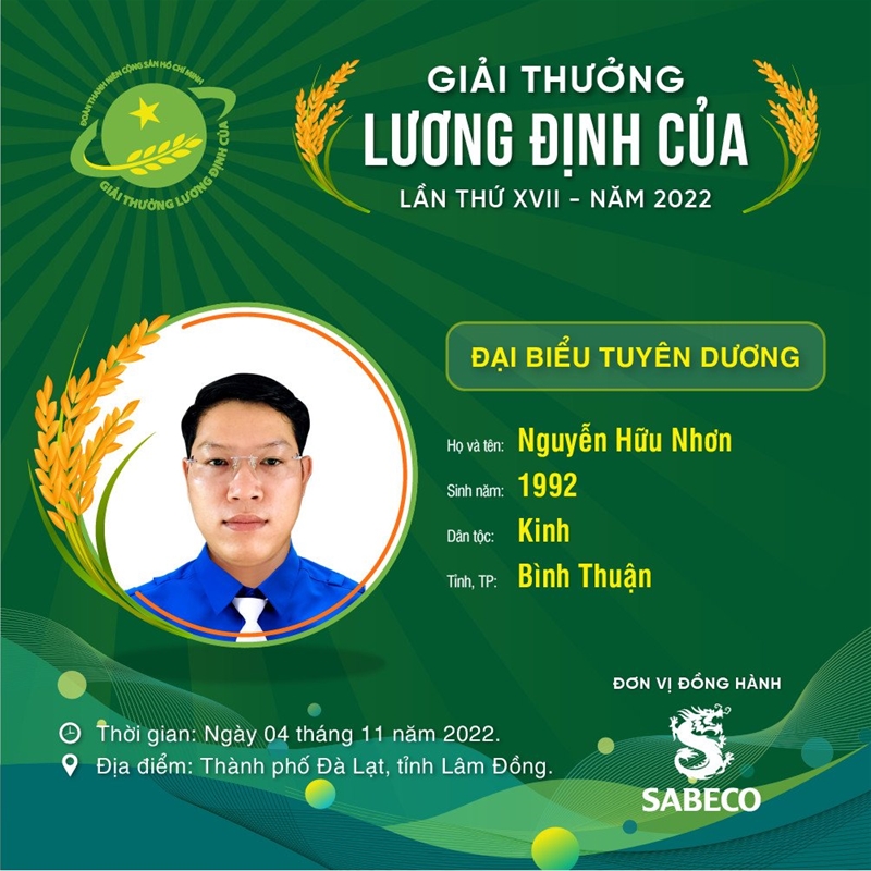 Nhờ những nỗ lực của mình, Ban Thường vụ Tỉnh đoàn Bình Thuận đã chỉ đạo cho Ban Phong trào Tỉnh đoàn phối hợp với huyện đoàn Đức Linh tổ chức tuyên truyền, quảng bá sản phẩm của anh Nhơn trên các trang mạng xã hội do Đoàn Thanh niên quản lý, trưng bày sản phẩm tại Đại hội Đoàn TNCS Hồ Chí Minh huyện Đức Linh, Đại hội Đoàn TNCS Hồ Chí Minh tỉnh Bình Thuận lần thứ XIII nhiệm kỳ 2022 – 2027; giới thiệu các sản phẩm đến các cơ sở thành viên của Hội Doanh nhân trẻ tỉnh và hoàn chỉnh hồ sơ giới thiệu anh Nhơn tham gia xét tặng giải thưởng Lương Định Của lần thứ XVII năm 2022. Anh Nguyễn Hữu Nhơn xuất sắc là một trong hai thanh niên nông thôn tiêu biểu và là một trong 57 đại biểu toàn quốc được tuyên dương Giải thưởng Lương Định Của lần thứ XVII năm 2022. Giải thưởng Lương Định Của là một phần thưởng xứng đáng cho những cống hiến và khát vọng vươn lên của anh Nguyễn Hữu Nhơn.