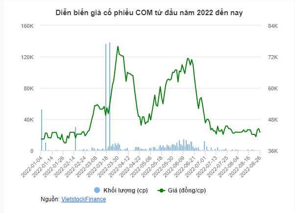 Trên thị trường, giá cổ phiếu COM đang được giao dịch quanh mức 43,000 đồng/cp (phiên chiều 26/08), giảm 43.42% so với đỉnh 76,000 đồng/cp phiên 31/03.