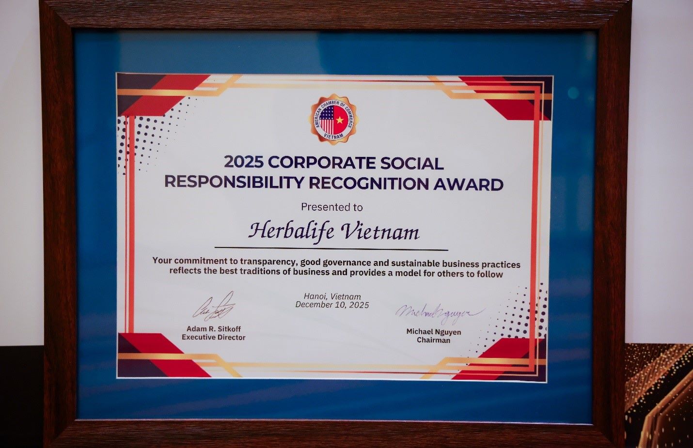 Hà Nội, ngày 10 tháng 12 năm 2025 – Herbalife Việt Nam, một trong những công ty, cộng đồng, và nền tảng hàng đầu về sức khỏe và thể chất, vinh dự năm thứ tám liên tiếp nhận giải thưởng Trách Nhiệm Xã Hội Doanh Nghiệp (CSR) của Hiệp Hội Thương Mại Mỹ (AmCham). Giải thưởng Trách Nhiệm Xã Hội Doanh Nghiệp AmCham ghi nhận và vinh danh các công ty là thành viên của AmCham thể hiện sự liên kết hiệu quả giữa hoạt động kinh doanh và xã hội, đồng thời thực hiện mô hình kinh doanh theo cách tạo ra giá trị lâu dài về kinh tế và xã hội.