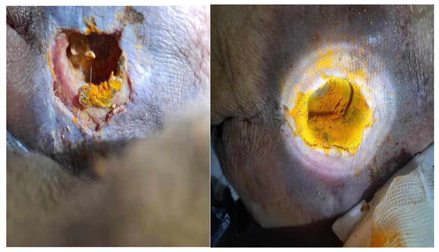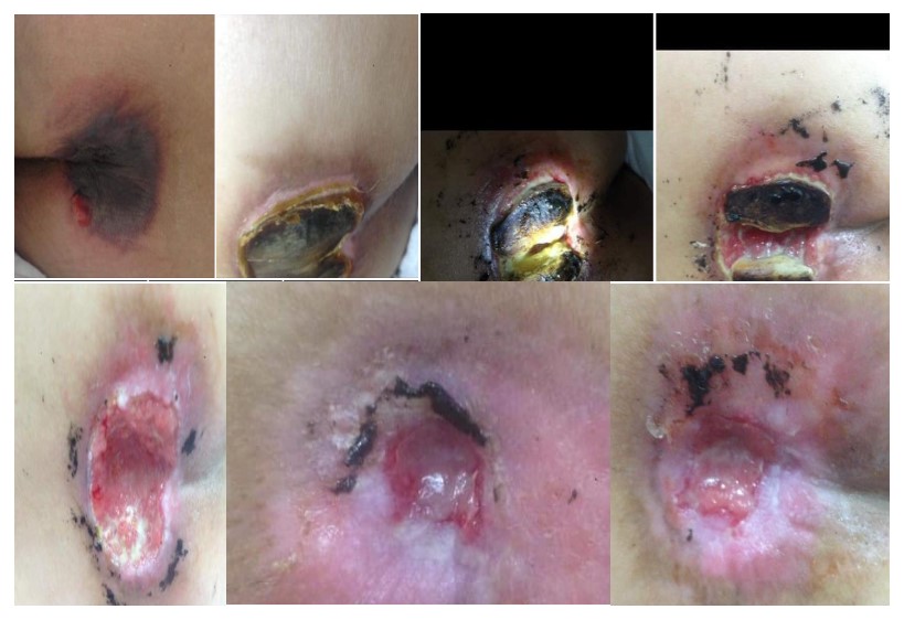 Một bệnh nhân mổ nên nằm lâu gây hoại tử vùng xương cụt. Hình 1-2 là điều trị chống nhiễm trùng , hình 2-4 điều trị Đông y bằng lá hoàn ngọc, và cắt vẩy gây đau bệnh nhân không chịu được thế là tây y không điều trị được. Vài thầy Đông y cũng chịu không có cách bóc vảy trên miệng ra. Lúc này gia đình bệnh nhân nhớ tới cao Đông y của danh y Nguyễn Trần Chuyển nên đã chở bệnh nhân xuống thăm khám, dán cao. Sau 2 ngày, vảy cứng được bóc ra và miệng thu nhỏ dần . Cứ vậy 2 ngày 1 lần thay cao, mỗi lần miếng thu hẹp kéo sẹo đầy lên là khỏi. Kết quả các ảnh còn lại, sau 2 tháng lên sẹo khỏi hoàn toàn. trường hợp này nhẹ lương Chuyển chỉ cần giao thuốc cao về gia đình tự dán, tới lúc khỏi thay cao hàng ngày chỉ cần chụp ảnh gửi cho Danh y Chuyển là được.