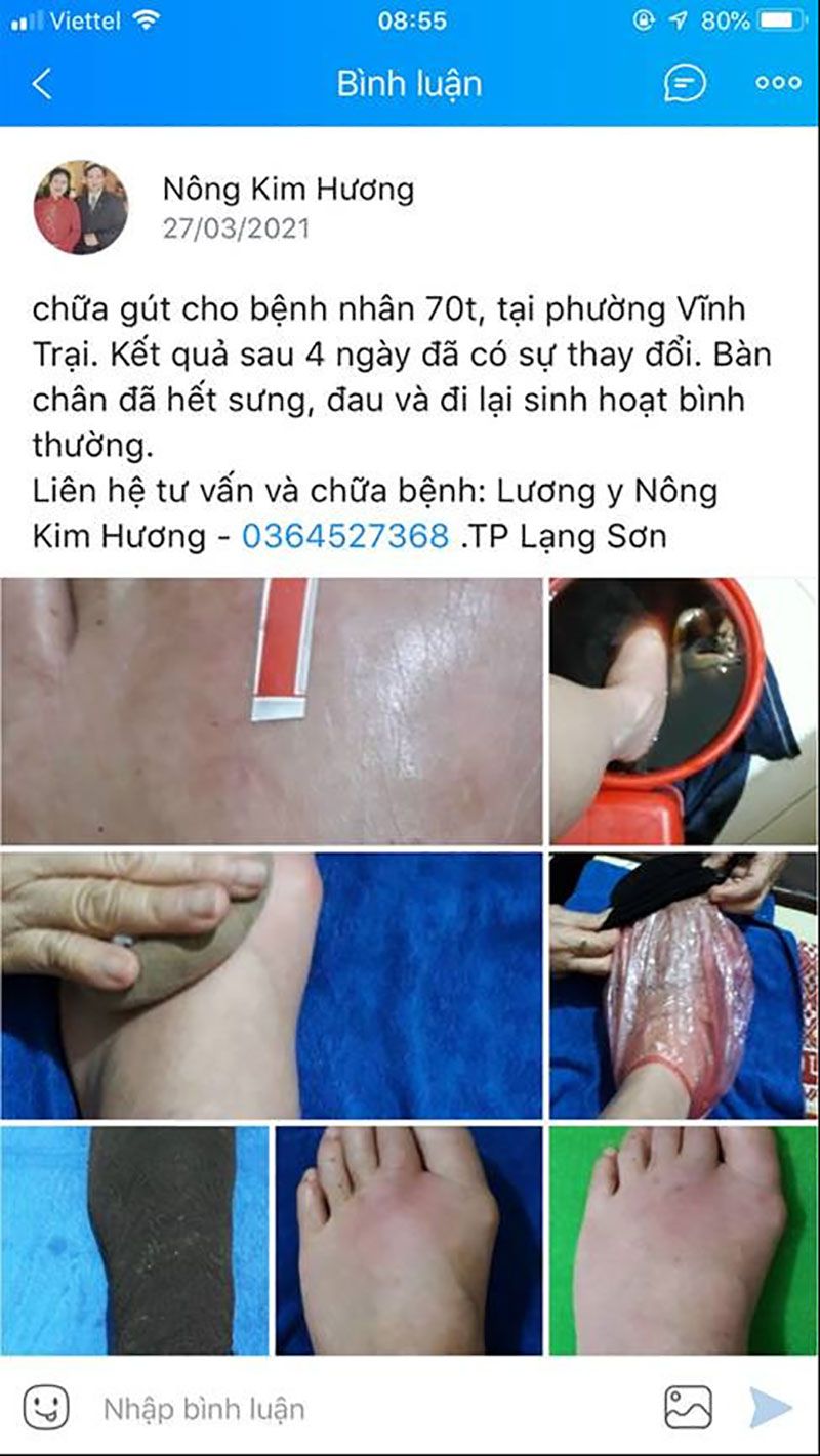Điển hình như bệnh nhân 70 tuổi, ở phường Vĩnh Trại bị Gút chỉ sau 4 ngay điều trị chân của người bệnh đã hết sưng, đau và đi lại bình thường. Và còn nhiều trường hợp bị các vấn đề về hệ thần kinh cơ xương khớp đã được lương y Nông Kim Hương chữa trị thành công.