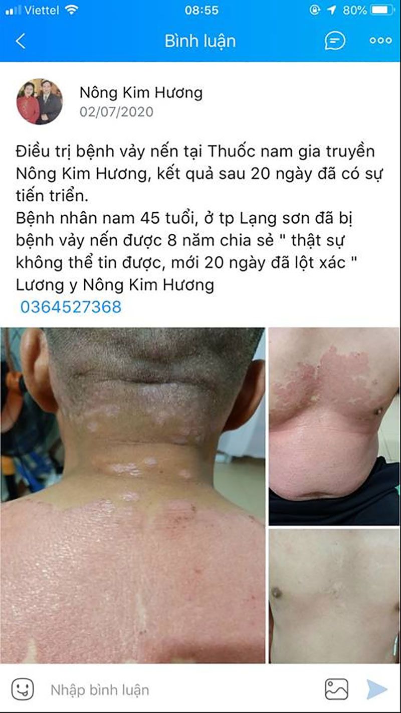 Và nhiều chứng bệnh ngoài da khác đã được lương y Nông Kim Hương chữa trị thành công. Với phương thức trong uống ngoài bôi các bệnh nhân nhanh chóng khỏi bệnh, không tái phát