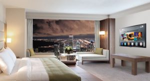 TV thường được đặt ở vị trí trung tâm trong phòng khách sạn và có...