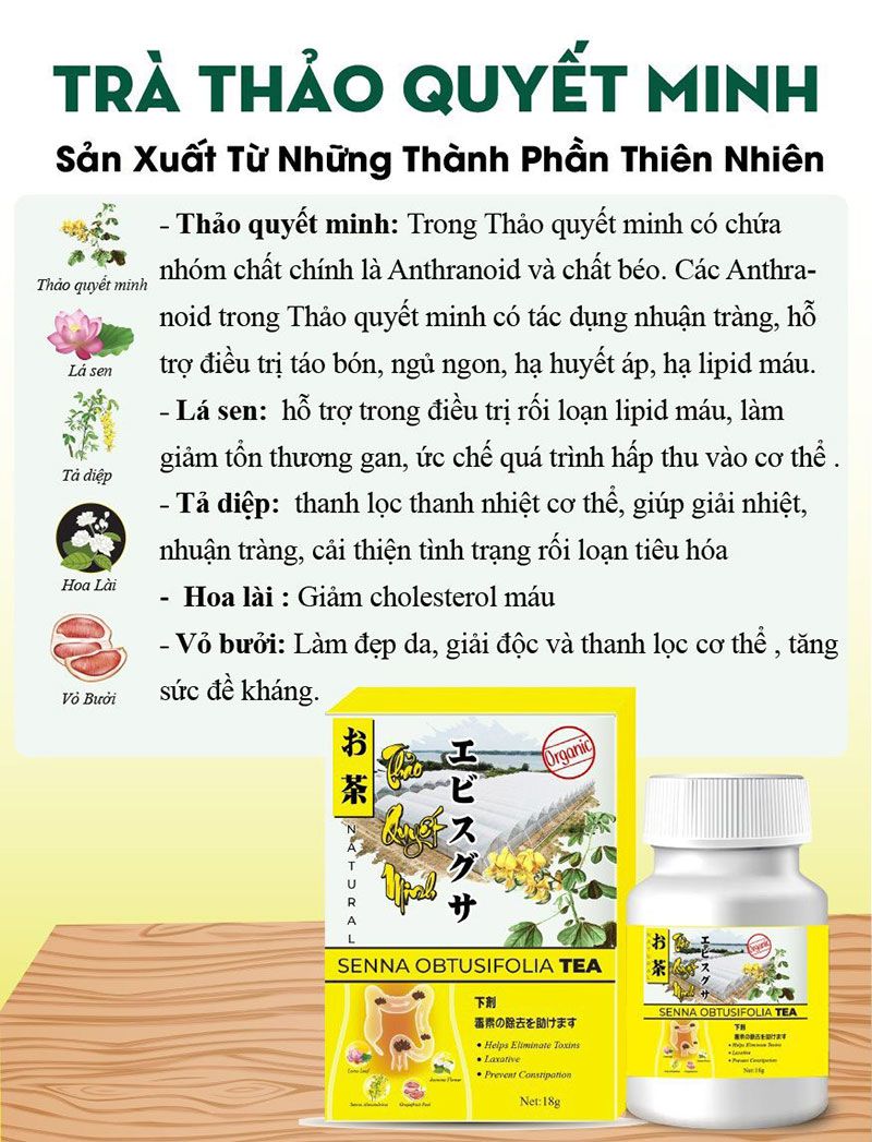 Trà giảm cân Thảo Quyết Minh với thành phần 100% thảo dược tự nhiên như: Thảo quyết minh (Senna Alexandrina): Chứa nhóm chất Anthranoid và chất béo hữu cơ có lợi cho sức khỏe. Lá sen (Lotus Leaf): Hỗ trợ ức chế quá trình hấp thu chất độc, hại vào cơ thể. Tả diệp (Senna): Thanh lọc cơ thể, thanh nhiệt, giải độc, cải thiện tình trạng rối loạn tiêu hóa. Hoa lài (Jasmine Flower):  Giảm cholesterol máu. Vỏ bưởi (Grapefruit Peel):  Làm đẹp da, giải độc, thanh lọc cơ thể và tăng sức đề kháng.